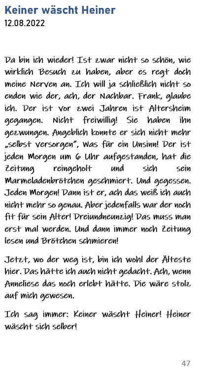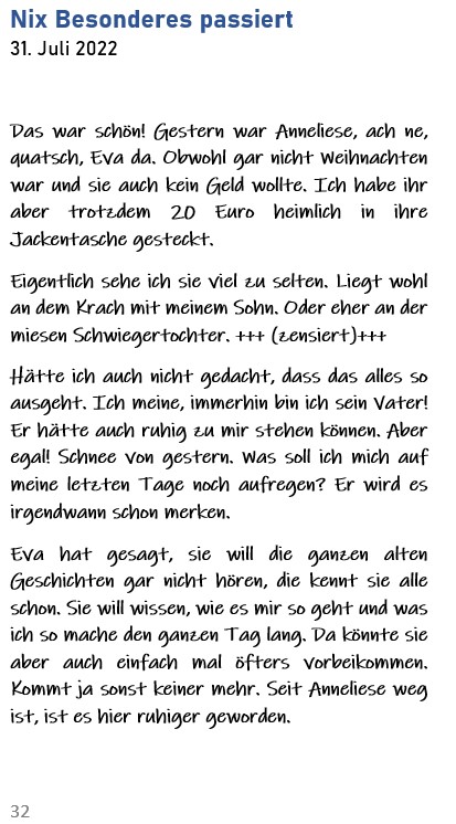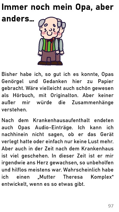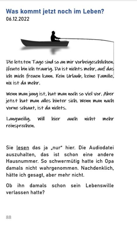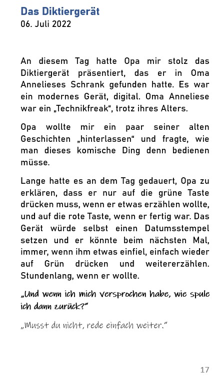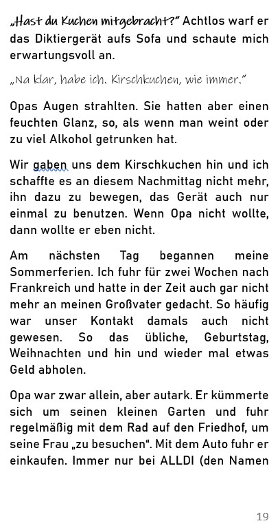 Opa Hase, oder besser, Opa Heiner, hat mir auf Tonband sein Tagebuch hinterlassen. Es habe es um meine Gedanken und Aufzeichnungen ergänzt. Opa Heiner und seiner Demenz habe ich mein erstes Buch gewidmet. Ich musste es mir von der Seele schreiben.